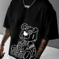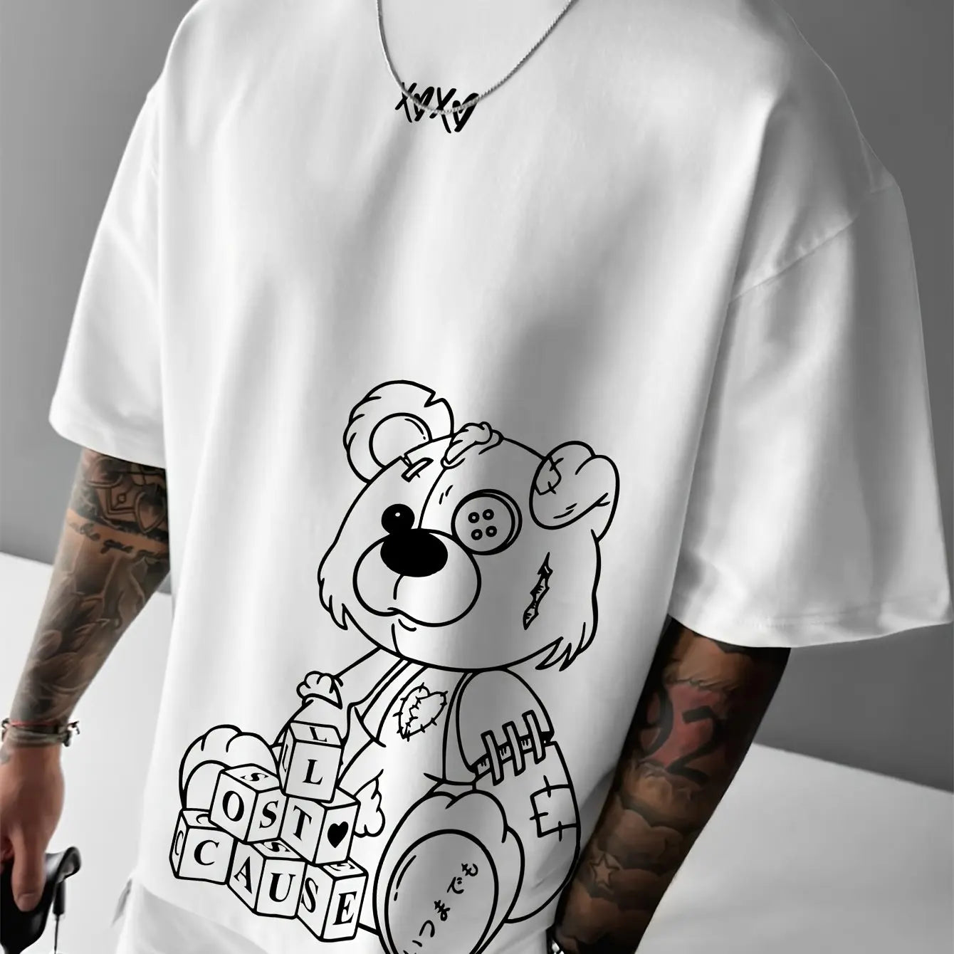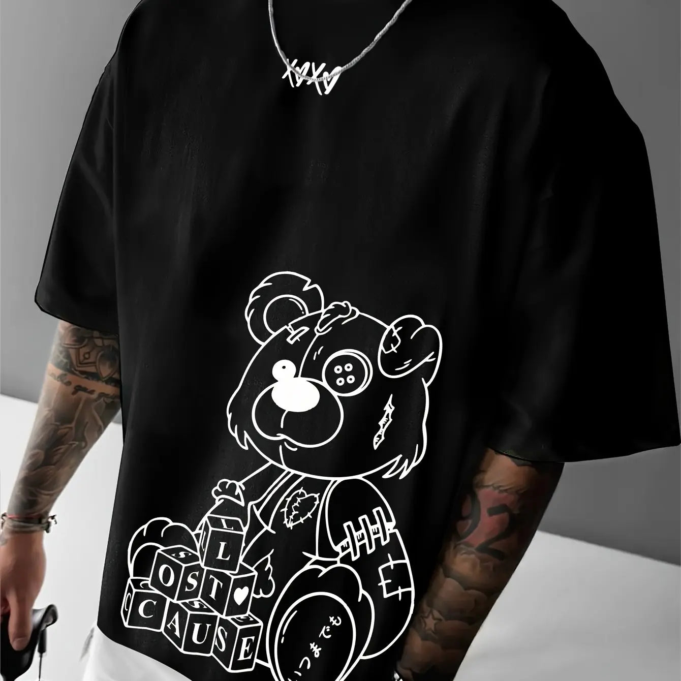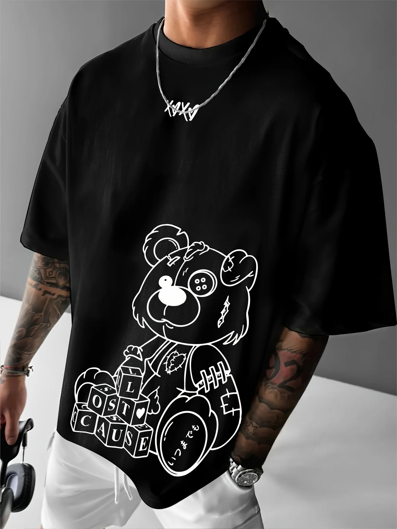 Verão masculino 100% algodão puro moda casual esportes solto dos desenhos animados urso padrão impressão em torno do pescoço manga curta camiseta topo